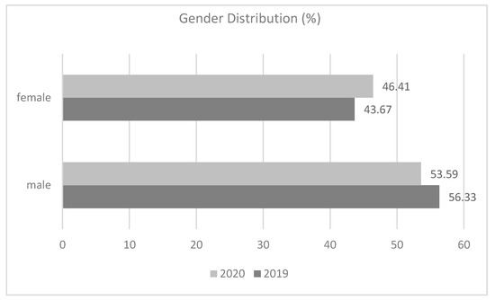 Comparing the frequency of patients in the dental office, it was observed that during both periods of time, male patients needed dental treatment in a higher percentage than female patients. However, comparing the attendance of female patients to the dental office, it is to be noticed that a higher percentage (46.41%) sought dental treatments during the Emergency state, compared to 2019, whereas the percentage of male patients in need of dental treatment decreased from 2019 to 2020. During the State of Emergency, a higher percentage of male patients sought dental treatments (53.59%) than female patients. The only difference was recorded for the 20–29 years age group, where the percentage of female patients outnumbered the male patients.