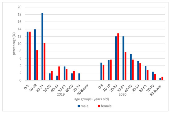The youngest patient seeking dental treatment in 2019/2020 was 2 years old, the median age of patients was 20 years in 2019 and 32 in 2020, and the eldest patients was 78 years old in 2019 and 96 years old in 2020. Statistically significant differences were recorded for the age groups 0–9 years (X2 = 25.9527, p = 0.001002) and 10–19 years (X2 = 9.6974, p = 0.001845), where the number of patients decreased during the Emergency state. No statistically significant differences were recorded between the other age groups.