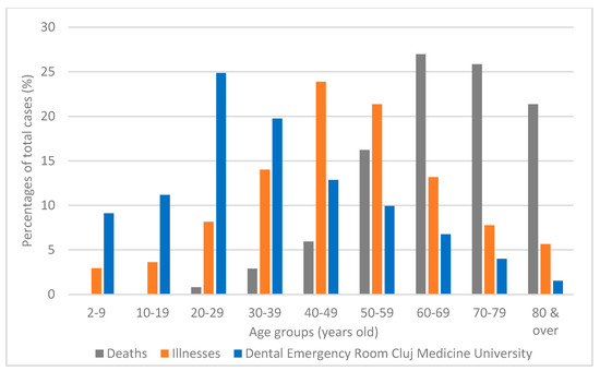 Comparing the number of patients seeking dental treatments with the total number of COVID-19 confirmed cases and COVID-19-related declared deaths in Romania (Figure 3), data indicate that there is an indirect correlation between the number of patients attending dental emergency and the number of COVID-19-related declared deaths per age group.