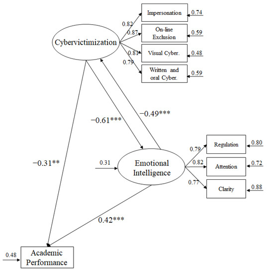 - The cybervictimization negatively predicted EI (β = –0.61, p < 0.001) and academic performance (β = –0.31, p < 0.01). In other words, cybervictimization has a negative influence on the EI levels of students, affecting their academic performance negatively.