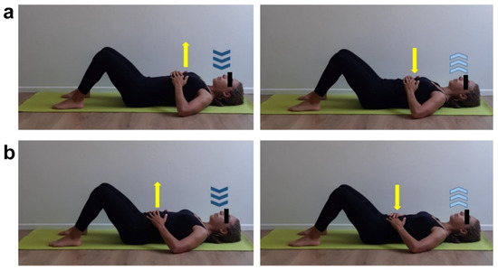 Breathing exercises. (a) Supine position, flexed legs. Focus on costal breathing by placing open hands on last ribs and perceiving chest expansion/retraction (yellow arrows). Inhale (dark blue arrows) through the nose, direct the breath to the center of chest and exhale (light blue arrows) through the mouth. Five min work. (b) Supine position, flexed legs. Focus on diaphragmatic breathing by placing open hands on abdomen. Inhale (dark blue arrows) through the nose and perceive abdomen lifting upward (yellow arrow), direct the breath to lower chest area and exhale (light blue arrows) through the mouth perceiving abdomen getting downward (yellow arrow). Five min work.