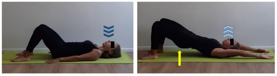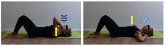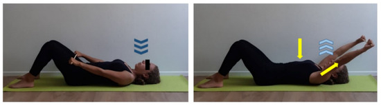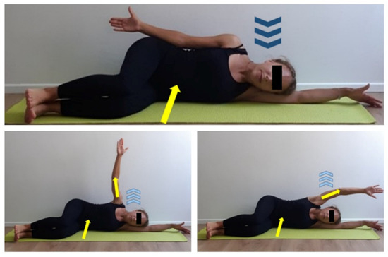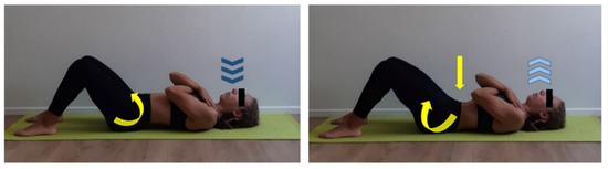 Tactile and verbal cues were incorporated to encourage diaphragmatic excursion during inspiration and promote a relaxed expiration. Indeed, a good coordination between the performed movements and inhalation/exhalation phases increases the exercise effectiveness. Spine and pelvis mobilization exercises were also performed (Figure 3 and Figure 4).