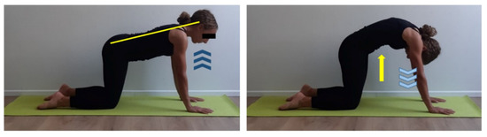 Spine mobilization exercise in quadruped position. Quadruped position, neutral spine attitude (yellow line), set hands shoulder-width apart and knees and feet hip-width apart. Inhale (dark blue arrows) then exhale (light blue arrows) and perform a posterior pelvic tilt and a head flexion (yellow arrow), inhale, and get back to start position paying attention not performing an anterior pelvic tilt. Two sets of 10 repetitions, 30 s recovery.