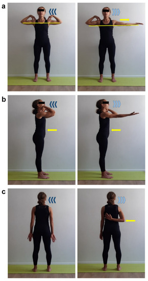 Upper limbs mobilization exercises on different plans. (a) Orthostatic position, lift straight arms out at body sides until reaching shoulders level (yellow line), keep gaze and upper limbs parallel to the floor and flex forearms. Touch both shoulders with ipsilateral hand’s fingers, activate core muscles and inhale (dark blue arrows). Keeping this position, exhale (light blue arrows) and alternate right and left forearm extension/flexion on arm. Focus on forearm extension performing a complete movement from elbow to fingertips (yellow line and arrow). Three sets of 30 s repetitions, 15 s recovery. (b) Orthostatic position, repeat previous exercise on sagittal plan, focusing on core muscles activation (yellow arrow). Three sets of 30 s repetitions, 15 sec recovery. (c) Orthostatic position, set straight arms by your sides with pronated hands. Inhale (dark blue arrows), exhale (light blue arrows), bend one forearm at a time behind back, trying to touch the inferior angle of opposite scapula with the back of the hand. In order to achieve a higher range of motion, keep elbow close to the trunk (yellow arrow) first and then flex forearm. Three sets of 30 s repetitions, 15 s recovery.