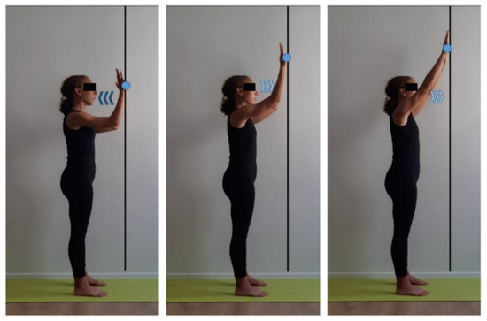 Scapulohumeral mobilization exercise in orthostatic position. Orthostatic position a step apart from the wall, lift both upper limbs and flex forearms placing the back of hands at gaze height (light blue dot), inhale (dark blue arrows). Exhale (light blue arrows) while performing an upward upper limbs extension. Focus on keeping trunk position, avoiding leaning back or forward. Three sets of 8 repetitions, 30 s recovery.