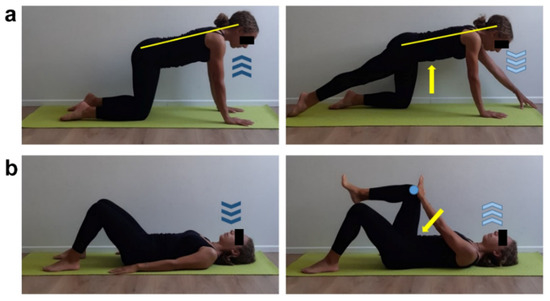 Thoraco-abdominal stabilization exercises. (a) Quadruped position, neutral spine attitude (yellow line), set hands shoulder-width apart and knees and feet hip-width apart. Inhale (dark blue arrows) and activate core muscles, then exhale (light blue arrows) while performing an extension of right lower limb and left upper limb keeping toes and fingertips in touch with the floor. Focus on hips-spine-shoulders-head alignment (yellow line), core muscles activation (yellow arrow) and feel upper limb stretching forward and lower limb backward. Two sets of 6 repetitions, 1 min recovery. (b) Supine position, rest straight arms by body sides and hand palms on the floor, flex both legs and place feet hip-width apart on the floor, inhale (dark blue arrows). Lift right lower limb keeping 90 degrees flexed leg and forming a 90 degrees angle between thigh and upper body, place left hand palm on right knee without touching it by fingers (light blue dot), exhale (light blue arrows) while performing an opposite push between hand palm and knee. Slowly get back to start position. Repeat with opposite hand/knee. Focus on performing opposite push until the exhalation phase is completed and perceiving an abdomen downward retraction (yellow arrow).