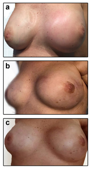 - Chourmouzi, D.; Vryzas, T.; Drevelegas, A. New spontaneous breast seroma 5 years after augmentation: A case report. Cases J. 2009, 2, 7126. [Google Scholar] [CrossRef]