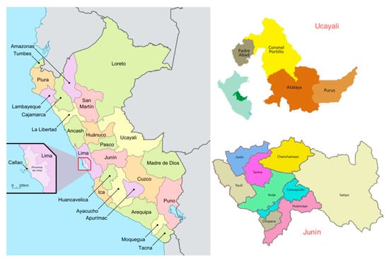 Map of Peru: Central Jungle of the Peruvian Amazon. Junín and Ucayali departments [19,20,21].