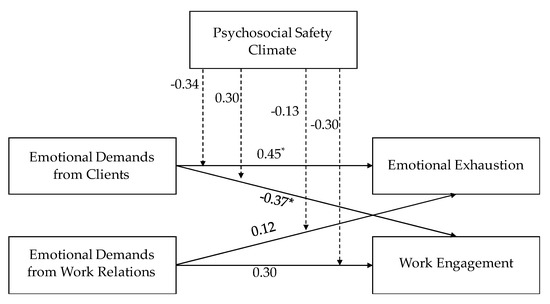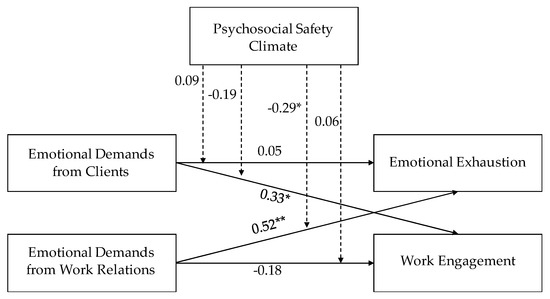 Our results did not support the hypothesis that PSC would also moderate the effects of emotional demands on work engagement. Previous studies found moderating effects of PSC on work engagement, by decreasing the negative impact of general job demands [32] and bullying/harassment [51]. However, no previous studies explored whether PSC moderated the impact of emotional demands on work engagement, so results cannot be directly compared. One possible explanation is that we only found one significant negative direct effect of emotional demands (from clients) on work engagement, but close to being non-significant.