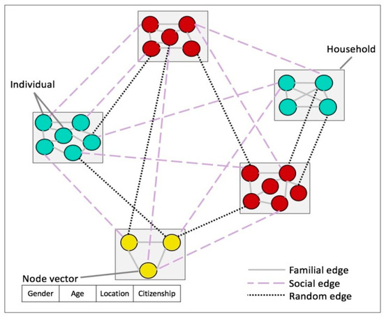 Each edge eu,v connecting node u and v has a type attribute describing its formation. Here, we use three edge types. The first one is familial when the two nodes u and v belong to the same household. The second is social when eu,v is formed as a result of the similarity between u and v. The third one is random when eu,v is formed completely at random. Social edges represent contact relationships as a result of sharing school, work, interests, and neighborhoods. Random edges represent contact relationships that occur as a result of coming into contact with another individual in a public place, a taxi, an airport, etc., or due to social contact that is not based on similarity.