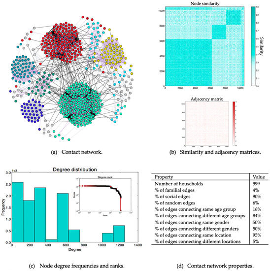 Generated contact network information. (a) Part of the generated contact network showing contact relationships between 50 randomly selected households. The gray edges are familial, the purple edges are social, and the black edges are random. (b) Similarity and adjacency matrices. Each cell in the adjacency matrix indicates the existence (dark cell) or the absence (white cell) of an edge between each node pair. (c) Degree distribution. (d) General network properties.