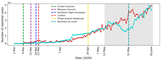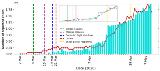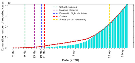The first positive COVID-19 case in Saudi Arabia was confirmed on 2 March 2020 with more cases sporadically appearing in the following few weeks [53,54,55]. According to the Saudi Ministry of Health [56], the vast majority of infected people were home-comers from high-risk regions and their immediate contacts [53,57,58].