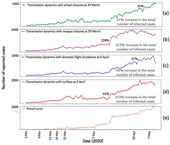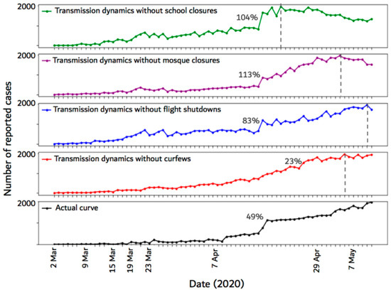 To determine the efficacy of the imposed control measures in Saudi Arabia, we simulated the epidemic without each measure individually for the period from 2 March 2020 to 11 May 2020. Then, we compared the resulting simulation curve with the original epidemic curve. The results of this analysis provided an estimate of the number of new cases that were prevented using the control measure. Figure 6 illustrates the epidemic curves produced from not implementing the major control measures (i.e., school closures, mosque closures, domestic flight shutdowns, and curfews) imposed by the Saudi government.