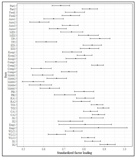 At first, the item characteristics (mean, standard deviation, skewness, kurtosis, percent missing) were analyzed. For further analyses (except for the confirmatory factor analysis), multiple imputation (with five imputed datasets) with predictive mean matching [104] was used to account for missing values. Parcel summaries of scales [105] and all other analysis variables were included in the imputation model with the assumption that missing values are missing at random. Analyses run on each imputed dataset were pooled according to Rubin’s rules [106] and the D1 (multivariate Wald test) statistic was used for multi-parameter inference [104]. Given that the indicators’ multivariate distribution has a strong influence on confirmatory factor analyses’ (CFAs) estimation results, we calculated Mardia’s multivariate skewness and kurtosis. Subsequently, the factorial structure of the scales was tested with CFA. The measurement model contained 17 factors (i.e., participation, feedback, autonomy, mental demands, time pressure, emotional demands, social support, competition, mobbing, physical burden, risk of accident, training opportunities, career advancement, job security, employability, work life conflict, and income satisfaction) that were allowed to correlate. We tested the factorial structure for each subgroup separately to see if the factor model adequately fitted across all subgroups in order to evaluate more stringent measurement invariance models in the next steps [107]. The MLR χ2-test statistic with robust standard errors [108] was calculated because it provides more accurate parameter estimations for items with five answer categories and for distortion from univariate and multivariate normality [109]. We fixed the factor variance to 1 and the factor mean to 0 for scale setting. We calculated the root mean squared error of approximation (RMSEA), standardized root mean square residual (SRMR), comparative fit index (CFI), and Tucker–Lewis index (TLI) to gauge model fit. For the RMSEA values between 0.05 and 0.08 indicate acceptable and values between 0.02 and 0.05 indicate good model fit. For the CFI and TLI values between 0.90 and 0.95 indicate acceptable and values between 0.95 and 0.99 indicate good model fit [110]. We used multigroup CFA (MGCFA) [110] to test for MI between the different language versions. Again, the fixed-factor method was used for scale setting as it has been found to be the best method to identify non-invariant indicators [111]. For the first group the factor mean is fixed to 0 and the factor variance is fixed to 1 while both are freed in all other groups in the metric and scalar invariance models. The ΔCFI was used to assess goodness of fit of MI models as it has been found to perform reasonably well in detecting (lack of) measurement invariance [112,113,114]. A ΔCFI > −0.01 between a baseline model and the resulting model indicates measurement invariance [110]. Full information maximum likelihood was used to account for missing values in CFA [115]. Criterion validity was assessed with intercorrelations (Pearson’s r). Furthermore, hierarchical regression analyses were used to investigate the predictive power of the QoW and QoE scales on the different forms of employees’ well-being. We included the variables in a stepwise manner in order to evaluate the incremental validity of the new scales. The first model included only demographic variables as control variables. In a next step, working time conditions were included as a second block of control variables. The third step included the QoE and the fourth step the QoW scales. We opted for this order because the first job quality indices mainly contained quality of employment measures [5]. Thus, we wanted to investigate the incremental contribution of the quality of work measures. R version 4.0.2 [116] was used for data analyses. Particularly, the mice package [117] was used for multiple imputation and the miceadds [118] and the naniar [119] packages for additional missing value analyses. The lavaan [120] and semTools [121] packages were used for the CFA and measurement invariance analyses. Finally, graphs were created with the ggplot2 package [122].