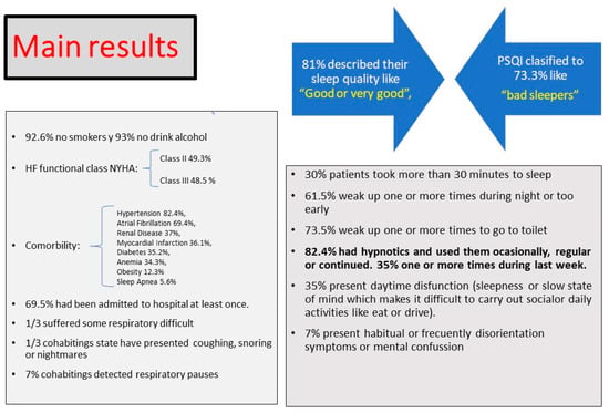Research into the perceived quality of sleep, especially in local populations, can help contextualize available evidence and identify different perspectives from which to launch interventions aimed at improving the health of patients with HF, delay hospital re-admissions, minimize hospital stays, and thereby reduce health spending. Therefore, the aim of this study is to describe the quality of sleep in Spanish patients with HF and to identify those aspects that negatively affect their health outcomes and that are modifiable.