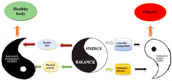 Like other studies [27,28] in different countries, the current study also applies the Yin–Yang concept as a theoretical framework. Yin–Yang theory is a kind of logic that views elements in relation to their whole. Usually, Yang is associated with the functional aspect of an object and has more energetic qualities, such as moving, ascending, expanding, progressing, and acting. Yin, on the other hand, is associated with the less energetic qualities, such as stillness, descending, and under-functioning states (Figure 2). Yin and Yang also apply to the human body. In traditional Chinese medicine, good health is directly related to the balance between Yin and Yang qualities within oneself [29]. If the Yin and Yang become unbalanced, one of the qualities is considered deficient or has vacuity. Yin–Yang theory is applied to the current study through the idea that one’s eating habits and physical activity should be balanced to avoid complications such as obesity [30]. A basic scientific rule is that every action has a reaction: if a person is physically inactive and has unhealthy eating habits, their energy stores will increase, which will cause obesity, and vice versa (see Figure 2). This research provides several opportunities to understand the current situation of Pakistan, especially the participation of Pakistani university employees in physical activities and the ratio of obesity. Notably, this type of data is generally difficult to access in Pakistan, especially from female participants, which makes this material extremely valuable.