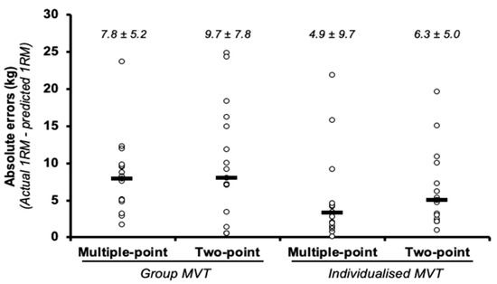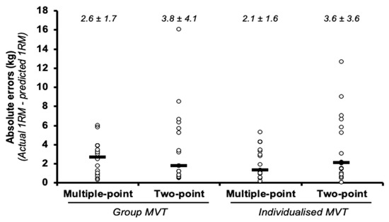 The ANOVA did not reveal a significant main effect for the MVT (F = 0.63, p = 0.438) or method (F = 4.3, p = 0.054). Furthermore, the MVT × method interaction did not reach statistical significance (F = 0.82, p = 0.380). The absolute errors ranged from 2.1 to 3.8 kg (Figure 1, with ESs that were trivial and small for the multiple- and two-point methods, respectively (Table 1). The correlations ranged from very large to nearly perfect (r range = 0.84 to 0.97), though higher 1RMs were associated with and increased overestimation (r range = 0.33 to 0.54).