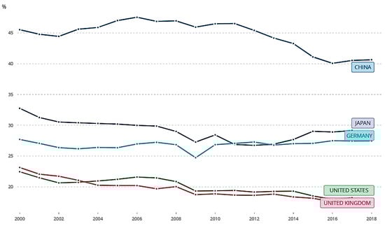 We choose polluting enterprises in the industrial and energy sectors as the main object of this research for the following reasons. First, the industrial and energy sectors are the major source of air pollution, which exerts a much larger impact on other important social-economic indicators, such as economic growth, employment, consumption, prices, and exports, compared to other air pollution sources. Second, it is more difficult to control air pollution emissions from the industrial and energy sector compared to other pollution sources, because of the problem of information asymmetry between the polluting enterprises and the regulator. Third, there have been relatively certain policy approaches for other pollution sources. For residential and commercial buildings, electrifying buildings with energy efficient technologies provides a pathway to reduce emissions. For the transportation sector, the Chinese government has made efforts to promote a greater market penetration of electrical vehicles. However, it is much harder to find a well-recognized policy approach to fully control emissions from the industrial and energy sectors. Fourth, although the share of industrial added value in gross domestic product (GDP) has continually decreased over the past several years in China, it is still much higher than that of developed countries [] (See Figure 1). A recent study [] also shows that the industrial green growth performance was low in China during 2000–2014. Thus, there is still a huge potential to reduce the pollutants emitted by the industrial and energy sectors.