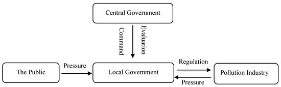 Firstly, we can provide a theoretical structure of all of the units related to Chinese local governments’ environmental regulation based on the analysis framework of Stigler and Pletzman’s government regulation model [,]. From an empirical perspective, the government’s environmental regulation comes from the demands of the various interest groups concerned with environmental regulation. In the 1970s, the Chicago school, represented by Stigler, first introduced the standard supply–demand analysis method into the research field of government regulation, proposing the theory of interest group regulation. They argued that regulation was derived from the influence exerted by industrial interest groups on public regulators to realize their interests []. Since the government has coercive power, industries will seek rent from the government to advance their interests; that is, the industry groups will capture politicians by using material benefits in order to gain government support. Peltzman expanded this theory, including consumer interest groups into the supply–demand model of regulation []. Interest groups of environmental regulation can be mainly divided into three types: regulators (government), polluting enterprises, and consumers (the public).