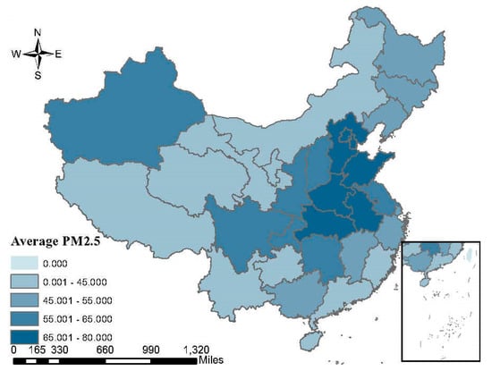 China is the largest developing country and the most populous country in the world, and its rapid process of urbanization and industrialization has brought about heavy pollution. Driven by the rapid growth of industrial production and energy consumption, a number of Chinese cities have reported air pollution levels significantly higher than the health-based standards. Air pollution can spread to surrounding areas and affect a wide range of people. High concentrations of PM2.5 increase the frequency of lung cancer, dyspnea, and heart disease. In the face of intense pressure, the Chinese government has introduced a series of measures and policies, and the policy effects are obvious, which have made the air quality improve in recent years. However, there is still a large gap in air quality between China and developed countries []. In Japan, Western Europe, and the U.S., the annual mean population-weighted exposure to PM2.5 is estimated to be below 15 μg/m3 on average, while the corresponding index of China as a whole was around 60 μg/m3 on average in 2016. The limit annual value is 35 ug/m3 according to new ambient air quality standards enacted by the Ministry of Environmental Protection of China in 2012. But in some regions of Eastern China, this index exceeds 100 μg/m3, which is 2–7 times the level of developed countries [].