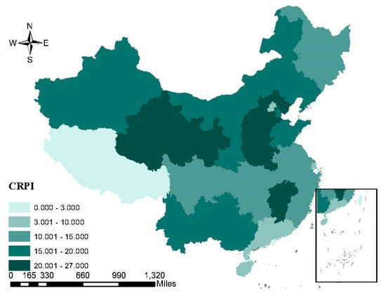 The spatial distribution of average annual economic contribution rate (CRPI) of six polluting industries in China. Source: Calculated by the authors on the basis of the Environmental Statistics Yearbook of China, 2005–2015.