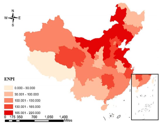 The spatial distribution of average annual proportion of the employees in population (ENIP) of six polluting industries in China. Source: Calculated by the authors on the basis of statistical yearbooks of 31 provinces, 2005–2015.