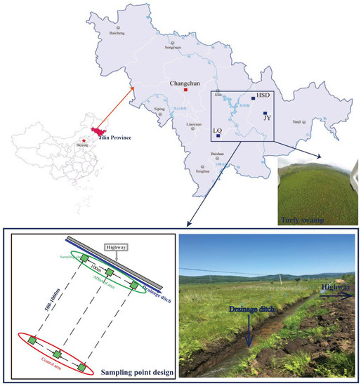 This study was performed in the Changbai Mountain area, Jilin Province, where there are a large number of turfy swamps. This area has a typical temperate continental monsoon climate with annual temperature and rainfall of 2–6 °C and 400–900 mm, respectively. The main vegetation of the turfy swamp in this area includes Carex meyeriana, Thelypteris palustris var. pubescens Fernald and Sanguisorba tenuifolia var. alba. Soil samples were collected from three similar and independent turfy swamps, namely Jiangyuan (JY; N43°7′, E128°1′), Longquan (LQ; N42°25′, E126°36′) and Huangsongdian (HSD; N43°39′, E127°39′) (Figure 1), which have been seriously disturbed by highway-related activities in recent years [6].