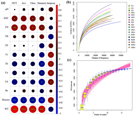 Pearson correlation heat map with correlation coefficient and significance levels based on the bacterial alpha-diversity estimators and environmental factors (a). * indicates significance test p < 0.05; ** indicates significance test p < 0.01; ***indicates significance test p < 0.001. Rarefaction curve (b) and species accumulation curves (c) of the 18 soil samples taken at the three turfy swamp sites.