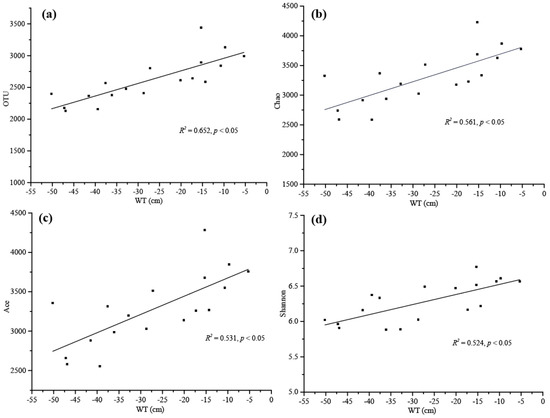 Linear regression relationships between water table (WT) and microbial alpha diversity reported as (a) OTU, (b) Chao, (c) Ace and (d) Shannon values.