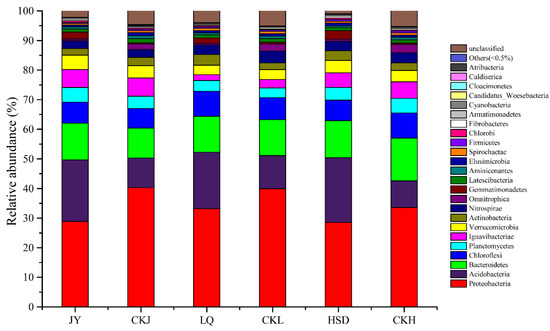 Relative abundance of the bacterial community composition at the phylum level. JY, LQ and HSD represent sampling sites in the highway-affected area, and CKJ, CKL and CKH represent the control sampling sites away from highway in the three turfy swamps.