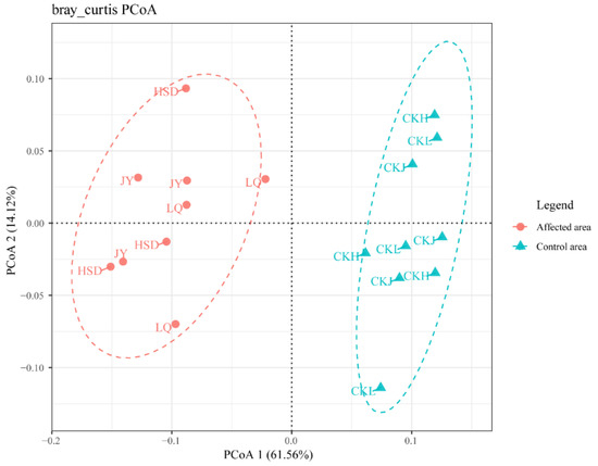Principal coordinates analysis (PCoA) of the bacterial communities was applied to reveal the distance and differences between the samples (Figure 5). The results showed that the soil samples obtained at the affected area were away from points of the control area in the three turfy swamps. The result of cluster analysis on genus level revealed that the 16S rRNA gene community compositions of the soils in the affected area significantly differed from those in the control area (Table 3). The results of ANOSIM testing performed on a Bray–Curtis matrix indicated that bacterial communities in affected areas were significantly different from those of the control areas in these three turfy swamps (phylum: R = 0.9538, p = 0.001; genus: R = 0.9609, p = 0.001), which may be due to the influence of environmental factors.