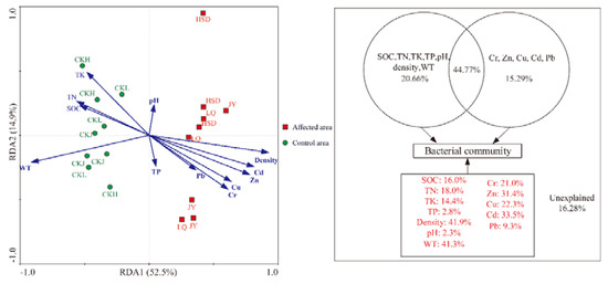 Redundancy analysis (RDA) clearly demonstrated the relationship between the bacterial community structure and environmental factors (Figure 6). The results indicated that all the twelve parameters explained 67.4% of the variation in the species data. Subsequent variance partitioning analysis revealed that the WT and physical and chemical properties, the five heavy metals and the interaction effects of these factors explained 20.66%, 15.29% and 44.77% of the total variation, respectively. Moreover, soil density, WT, Cd, Zn, Cu, Cr, TN, SOC and TK explained 41.9%, 41.3%, 33.5%, 31.4%, 22.3%, 21.0%, 18.0%, 16.0% and 14.4% of variance, respectively. Other factors, such as Pb, TP and pH only explained 9.3%, 2.8%, and 2.3% of total variance respectively. Ye et al. [27] have reported that Pr is a parameter for describing the significant level of correlation between individual environmental factors and microbial communities in RDA analysis. The Pr values were 0.001 for soil density, WT, Cd and Zn; 0.008 for Cu; 0.005 for Cr; 0.034 for TN; 0.030 for SOC; 0.043 for TK; and >0.05 for Pb, TP and pH in this study (Monte Carlo permutation test, 499 permutations). These results indicated that density, WT, Cd, Zn, Cu, Cr, TN, SOC and TK were the key factors affecting the microbial community.
