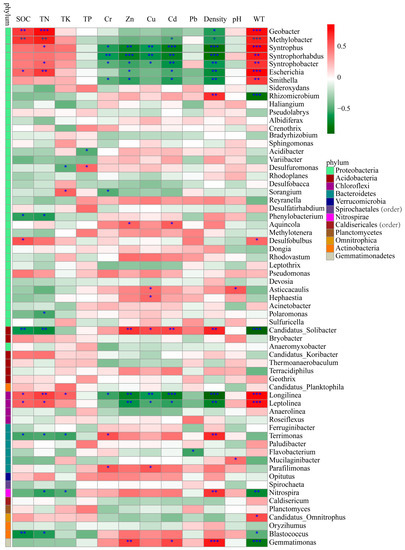 Pearson’s correlation coefficients were calculated to further reveal the correlations between these environmental factors and the bacterial abundance (Figure 7). The abundance of Geobacter and Methylobacter were significantly and positively correlated with SOC, TN and WT (p < 0.01) and negatively correlated with density (p < 0.05). The abundance of Syntrophus, Syntrophorh abdus and Syntrophobacter of the phylum Proteobacteria and Longilinea of the phylum Chloroflexi were significantly and negatively correlated with Cr, Zn, Cu, Cd and density and positively correlated with WT (p < 0.01). In addition, Syntrophus and Syntrophobacter were also positively correlated with TN (p < 0.05), and Longilinea showed a significant positive correlation with SOC and TN (p < 0.05). Escherichia showed a significant positive correlation with SOC, TN and WT (p < 0.01) and a significant negative correlation with Zn, Cd and density (p < 0.05), and Smithella exhibited a significant negative correlation with Cr, Zn, Cd (p < 0.05) and density (p < 0.01) and a significant positive correlation with WT (p < 0.01). Candidatus Solibacter (phylum Acidobacteria) and Leptolinea (phylum Acidobacteria) show the opposite trend; i.e., they were positively correlated with Zn, Cu, Cd and density and negatively related to WT, SOC and TN (p < 0.05). Additionally, there was a significant positive correlation between Gemmatimonas and TK, Zn, Cd and density (p < 0.05), whereas there was a significant negative correlation with WT (p < 0.001). These results indicated that the soil properties in this analysis had obvious effects on the soil bacterial communities, and SOC, TN, Cd, Cr, Zn, Cu, WT and density played a more important role in shaping the local bacterial community compared with other environmental factors.