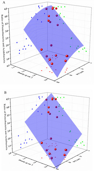 Polynomial model (A) and plane model (B) for estimating the ratio between Proteobacteria and Acidobacteria with predictor variables of density and WT. The strong positive correlation between the ratio and WT can be seen through the points on the a-plane, while the b-plane shows the unexpected negative correlation between the ratio and density.