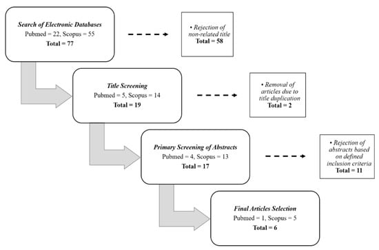 The delineated inclusion and exclusion criteria of selected articles were separately evaluated by two reviewers to ensure objectivity of final articles selection. This was followed by discussion between authors to establish a consensus in assessing the differences surfaced upon articles assessment. The combination of keywords used during the search process successfully identified 22 articles acquired from Pubmed, whereas 55 articles were obtained from Scopus database. From that, 17 articles from Pubmed and 41 articles from Scopus were excluded after thorough title screening, followed by the removal of 2 duplicate articles, and thus, we were left with 17 articles to work with. At the end of the review process, 11 articles were removed from the final article selection, as they were unrelated to cardiovascular disease. Therefore, only six related articles were included in the data extraction table. The article selection process is summarized in Figure 1.