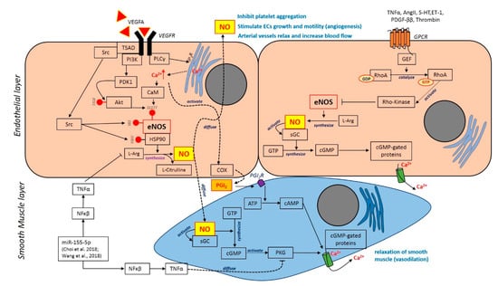 Targeted signalling pathway involved in endothelial cells (ECs) activation and vascular smooth muscle cells (VSMCs) proliferation and migration during intimal hyperplasia. The binding of vascular endothelial growth factor A (VEGFA) to its receptor VEGFR2 on ECs activates the PI3K pathway. Activated PDK1 phosphorylates Akt at Thr308 then phosphorylates eNOS at Ser1177 activating eNOS. VEGFA aslo activates the PLCγ pathway which increase Ca2+ concentration and activates eNOS via calmodulin (CaM). The binding of VEGFA also activates Src kinase which then activates eNOS through two mechanisms: (1) phosphorylation of Tyr83 on eNOS; (2) phosphorylation of heat shock protein 90 (HSP90) at Tyr300. Those phosphorylation causes the binding of HSP90 to eNOS and activates NO synthesis. Activated eNOS converts L-arginine in the presence of oxygen to L-citrulline and diffusible signalling molecule NO. NO secreted by ECs inhibits platelet aggregation to avoid thrombosis. NO diffuses into vessel walls, causing arterial vessels to relax and increase blood flow. The binding of agonist to G-protein–coupled receptors (GPCR) induces activation of Rho-kinase activity via GEF activation. The activity of RhoA is controlled by the guanine nucleotide exchange factors (GEFs) that catalyse the exchange of GDP for GTP. Rho-kinase activity is enhanced by binding to the active GTP-bound RhoA. However, this mechanism is negatively regulating eNOS activation for NO production. Diffused NO binds to its intracellular receptor soluble GC (sGC) which produces cGMP from GTP. The increase in intracellular cGMP concentration bind to cGMP-dependent protein kinases (PKGs) and cGMP-gated ion channels results the increase of Ca2+ and relaxation of smooth muscle.
