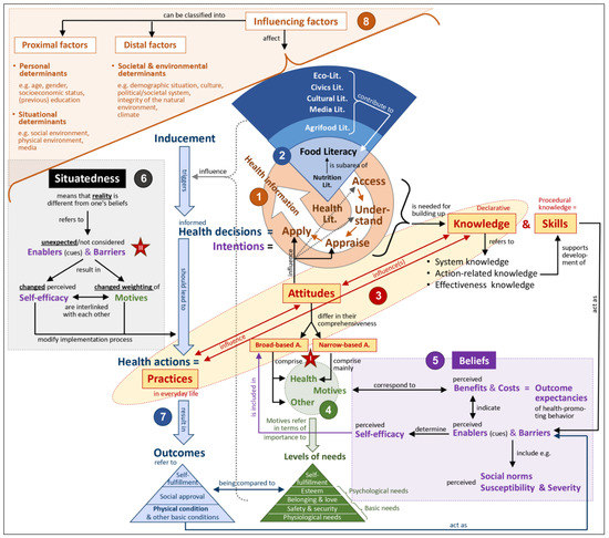 Figure 1 shows the Conceptual Model Map on Health and Nutrition Behavior (CMMHB/NB) we developed, which is explained below. Due to the complexity of the CMM, its various parts are numbered and colored differently. Key terms that either appear in the CMM or are of explanatory or structuring importance are printed in bold in the following model description.