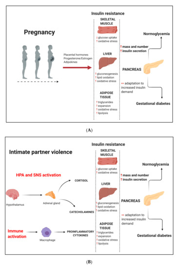The importance of cardiometabolic health during pregnancy is widely recognized. As such, women are routinely screened for common pregnancy-related disorders such as GDM and hypertension, although behavioral and psychological factors are often neglected. A study of sociodemographic and behavioral risk factors and the most common medical conditions during pregnancy (diabetes, hypertension, preeclampsia, and body mass index (BMI)) in a population of high-risk, urban, African American mothers demonstrated that IPV was the 4th strongest predictor of poor pregnancy outcomes after prepregnancy BMI, preconceptional diabetes, and employment status [64]. GDM was also associated with these adverse pregnancy outcomes, albeit not as strongly. Another USA-based study found that IPV, but not GDM, was significantly associated with pregnancy trauma and placenta abruption [65]. IPV and GDM share risk factors such as low socioeconomic status and low education level [29,44], suggesting that IPV and GDM may have a shared etiology and could interact to increase disease severity. Therefore, we conducted a literature search to identify studies linking these two conditions. We used keywords “intimate partner violence” OR “abuse” OR “domestic violence” AND “gestational diabetes” to increase the sensitivity of the search. The studies that reported on these conditions are summarized in Table 2 (Supplementary Figure S2). Both IPV and GDM are independent predictors of adverse pregnancy outcomes and pose significant economic costs to the health system [42], while their interaction may exacerbate these effects. IPV induces stress and depression [11,63,66,67], which are both associated with an increased risk for GDM [11,68,69]. Thus, stress and depression may act as mediators between IPV and GDM. Furthermore, abuse during childhood and adolescence has been linked with stress and depression [12,70], IPV [39], and as reported in Table 2, an increased likelihood of developing GDM [38,39,40] during adulthood. Evidence for biological mechanisms that link IPV and GDM is lacking, although it is conceptually plausible that these conditions may act synergistically to increase disease severity. Understanding the relationship between these conditions is important, particularly given the high prevalence of IPV among women of reproductive age and its roles as a potential risk factor for GDM. Stress and depression are common mental health consequences of IPV, which may present an additional mechanism of insulin resistance and glucose intolerance during pregnancy. IPV induces dysregulation of the HPA axis, leading to the hypersecretion of cortisol and insulin resistance. This insult may exacerbate the normal pregnancy insulin-resistant states, i.e., decreased insulin sensitivity and increased lipid oxidation and oxidative stress in skeletal muscle, decreased insulin sensitivity, and increased gluconeogenesis, lipid oxidation, and oxidative stress in liver and decreased insulin sensitivity and increased triglycerides, tissue expansion, lipolysis, and oxidative stress in adipose tissue [15]. These effects may place an additional burden on β-cells, which may lead to a reduced capacity to mount compensatory effects, leading to the development of GDM (Figure 1C). A higher prevalence of GDM was observed in women who reported IPV, however, this did not reach statistical significance [71]. Furthermore, associations between IPV and GDM are marked by inconsistent or unexpected results. Two studies failed to show an association between IPV and GDM [10,72] and may be due to variabilities in the populations studied or inadequate sensitivity and specificity of the psychometric instruments used [73], as highlighted in the study by Dahlen et al. [70]. Furthermore, most of the studies that investigated the association between psychological factors and GDM were retrospective or based on self-report, which is subject to bias, and lacked objective clinical measures of GDM. Despite the limited studies that have directly linked IPV with GDM it is apparent that screening for both these conditions should form part of postpartum care [74]. Large population-based studies are required to further explore the relationship between IPV and GDM.