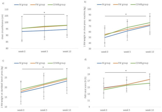 Evolution over the three test occasions of the three RT groups for (a) chest circumference, (b) 1-RM on chest press, (c) 1-RM on dumbbell bench press, (d) FMS total score. M, RT group using machines (N = 12); FW, RT group using free weights (N = 12); COMB, RT group changing from machines to free weights after 5 weeks (N = 12); FMS, Functional Movement ScreenTM; *: significant time effect at p < 0.001.