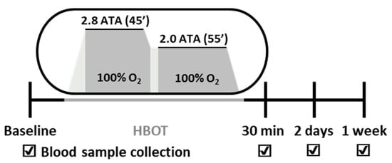 HBOT was performed in a single or multiplace hyperbaric chamber (IBEX Medical Systems, Seoul, Korea). Compression was achieved to 2.8 atmospheres absolute (ATA) for 45 min and then 2.0 ATA for 55 min (Figure 1). For all participants, blood samples were collected before (baseline), immediately, 2 days, and 7 days after HBOT.