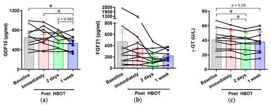 To evaluate the effect of HBOT on metabolic stresses, we measured the serum levels of the following humoral factors related to cellular stress: GDF15, FGF21, and γ-GT. The expressions of GDF15 and FGF21 are increased upon mitochondrial stress, which elicits a protective response against pathogenic progression. γ-GT is involved in glutathione metabolism to preserve redox homeostasis []. Elevated serum γ-GT predominantly indicates liver disease, but is also detected in cardiovascular and metabolic diseases related to oxidative stress []. We observed that the serum GDF15 concentration was decreased at 1 week after HBOT. There was also a significant reduction of γ-GT at 2 days after HBOT. The circulating level of FGF21 tends to be reduced by HBOT, but this change was not significant (Figure 2).