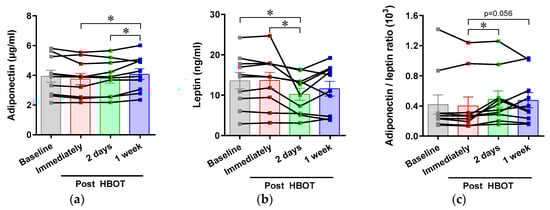 Effects of an acute hyperbaric oxygen exposure on the serum levels of adipokines. Blood from volunteers was taken at different time points before and after HBOT. Serum levels of (a) adiponectin and (b) leptin were measured using a QMAP system, and (c) adiponectin to leptin ratio was calculated from the individual’s adipokine levels. HBOT, Hyperbaric oxygen therapy. * p < 0.05.