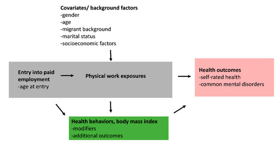 Logistic regression models were fitted to examine the associations of timing of entry into paid employment and physical work exposures with health outcomes. First, we ran models adjusting for age and gender or adjusting for age in gender-specific analysis. Second, we ran full multivariable models adjusting for all covariates. We also performed stratified analyses to determine whether leisure-time physical activity and overweight or obesity modify the associations between physical work exposures and health-related outcomes. Gender-specific results are shown in the Supplementary Material. The study design and the assumed relationships between the variables are illustrated in a simplified schematic Figure 1. We used STATA, version 15 (StataCorp LLC, College Station, TX, USA) for the analyses.