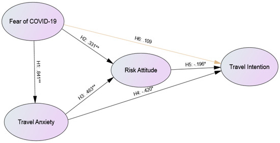 The results confirm the existing literature. Risk and security are some of the key concerns of tourists [49]. When anxiety and risk attitude decrease, travel intention increases. The results support the findings of previous studies [45,46,49,57]. This study introduced travel anxiety and risk attitude as mediating variables between fear of COVID-19 and travel intention. While fear of COVID-19 positively affects both travel anxiety and risk attitude (H1 and H2), anxiety also positively affects risk attitude (H3). The effects of travel anxiety and risk attitude on travel intention are negative and significant (H4 and H5). But the effect of fear of COVID-19 on travel intention is not significant (H6). This means that there is no evidence to suggest that fear of disease reduces people’s travel intentions. One explanation of this insignificant result is that COVID-19 is present worldwide; even when people are afraid of COVID-19, the differences between the risks in their hometown and that of a destination may not vary significantly. However, the fear of COVID-19 significantly impacts people’s travel anxiety and risk attitude, ultimately making them afraid to travel.