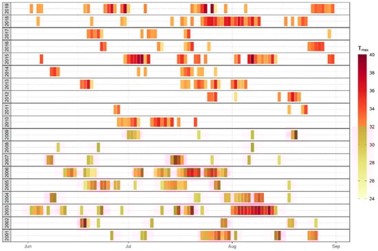 Figure 1 depicts those extreme heat events for the summer months June, July and August between 2001 and 2019. Each bar is equal to one of these days; additionally, the color of each bar indicates the intensity of the maximum temperature (Tmax in °C). The figure shows that the bulk of heat events appeared in July, and the frequency of summer heat events may reach up to a maximum of five (2013) or six (2006) events. Partly, lasting periods are interrupted by short-term instabilities of the high-pressure system with such as a fresh air intrusion of one day only. Furthermore, the figure shows considerably long-lasting extreme heat events during summer 2003, 2006, and 2018, with the longest heat record of 18 consecutive days in July and August 2018. Heat events could be shorter, but stronger and hotter as experienced by each two single heat events of 2015 and 2019, with a temperature record at this DWD site of 40.2 °C on 25 July 2019.