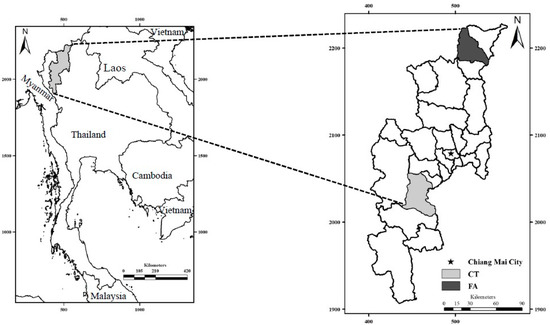 Maps of Thailand (left) and Chiang Mai Province, showing the Fang (FA) and Chom Thong (CT) districts, located at 19°54′26″ N, 99°2′26″ E and 18°25′2″ N, 98° 40′27″ E, respectively.