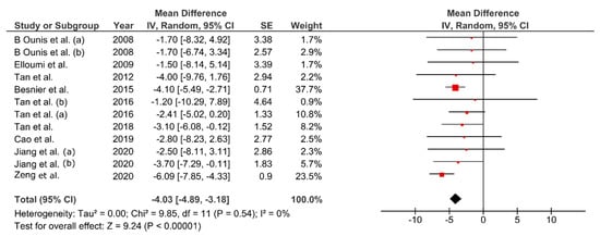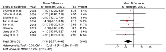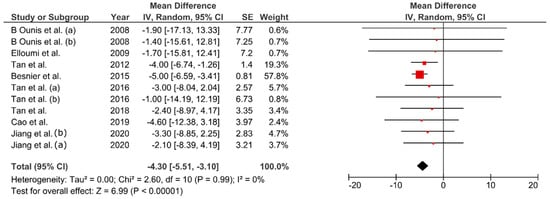 Bodyweight decreased between 1.88–6.52% from baseline values (MD: −4.30 kg; 95% CI: −5.51, −3.10; p < 0.01, Figure 3). Change percentage for FM ranged between 5.2–28.09% (MD: −4.03 kg; 95% CI: −4.89, −3.18 kg; p < 0.01, Figure 4). Waist circumference reduced between 0.8–5.1% (MD: −3.34 cm; 95% CI: −5.77, −0.91; p < 0.01, Figure 5) while FFM remained unchanged (MD = 0.08 kg, p = 0.85). The studies were homogeneous (I2 = 0%). The sensitivity analysis did not show effect size modifications for BW and FM, but high consistency among the studies (Figure A1).