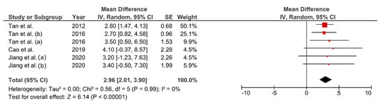 The VO2max increased between 6.5–12.7% (MD = 2.96 mL∙kg−1∙min−1, 95% CI: 2.01–3.90 mL∙kg−1∙min−1, p < 0.01, Figure 6). There was no heterogeneity between studies (I2 = 0%).