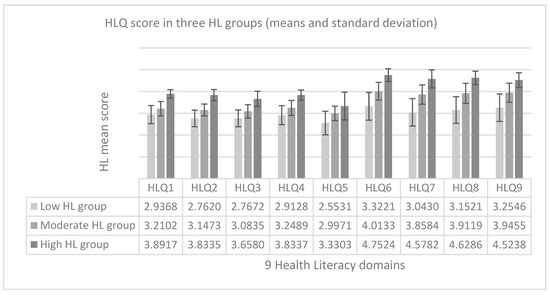 Health Literacy Questionnaire (HLQ) mean scores of 9 domains in three health literacy (HL) groups.