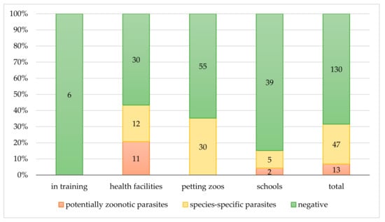 Among the studied contexts, the animals found to be affected by potentially zoonotic parasites attended health facilities and schools (Figure 2). In particular, 43.4% (n = 23/53) of animals attending health facilities were positive for at least one parasite species, and half of those, 11/23, presented zoonotic parasites, such as ancylostomatids, E. aerophilus, and G. duodenalis. In schools, 7/46 (15.2%) animals had parasites and 2/7 (28.6%) were dogs shedding T. canis ova. The cat shedding G. duodenalis cysts was not considered in the descriptive analyses of school settings because it was included in the category at major risk of exposure (i.e., health facilities) as previously stated in the Materials and Methods section; on the other hand, it is important to highlight that it represented a source of infection also for children in schools.